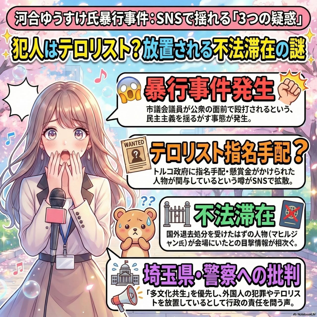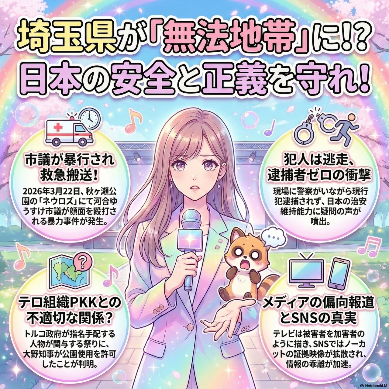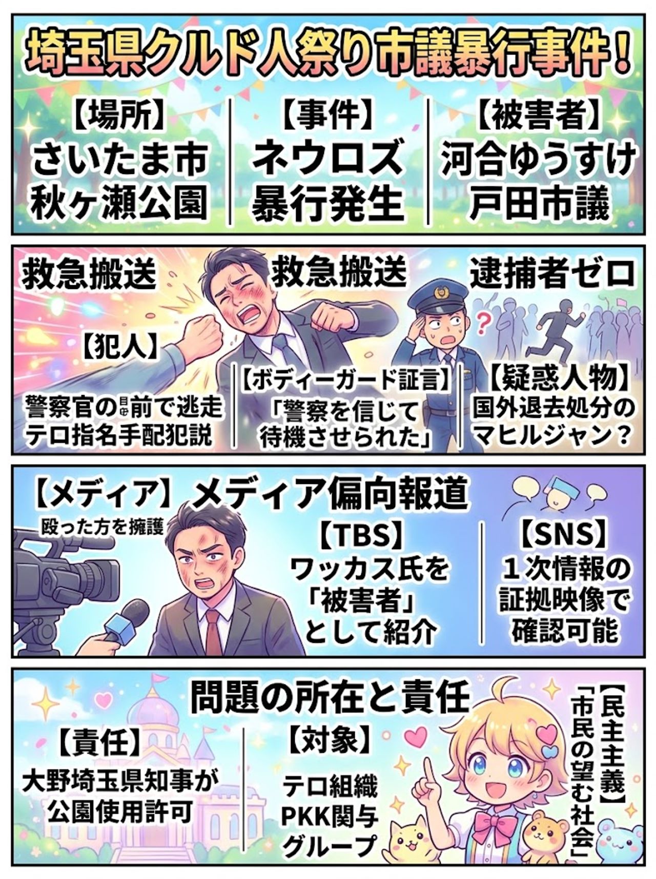 🚨はい、河合ゆうすけ氏は2026年3月22日にさいたま市秋ヶ瀬公園で開催されたクルド人の祭り「ネウロズ」において、特定の人物から顔面を殴打される暴行を受けました。
