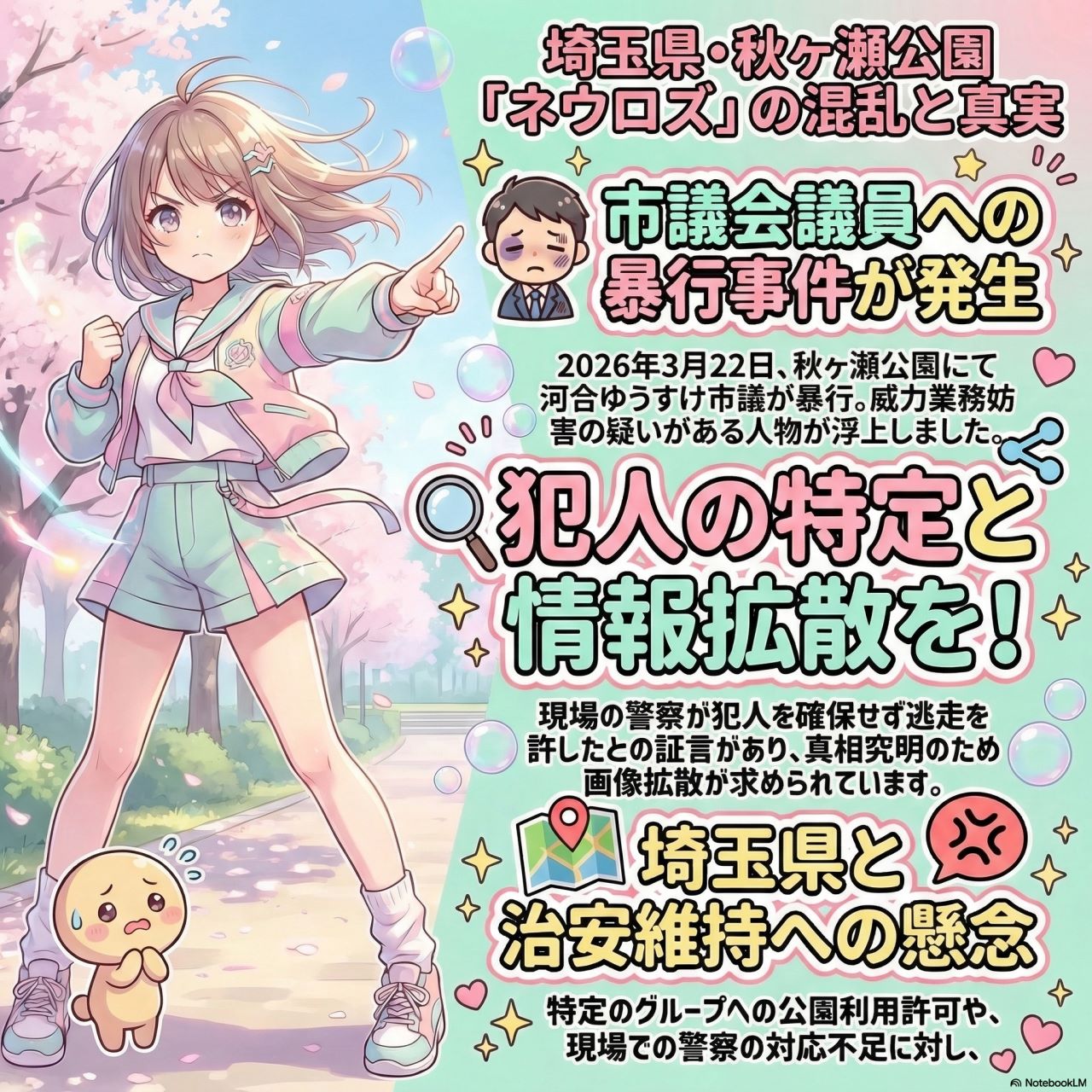 2026年3月22日、さいたま市秋ヶ瀬公園で開催された「ネウロズ」にて、市議会議員への暴行および威力業務妨害の疑いがある人物です。 現場の警察は犯人を確保せず、そのまま逃走を許したとの証言があります。メディアの偏向報道に立ち向かい、法治国家として真相を究明するため、 この画像を日本中に拡散し、情報の提供をお願いします。日本の安全と正義を守るため、ご協力をお願いします。