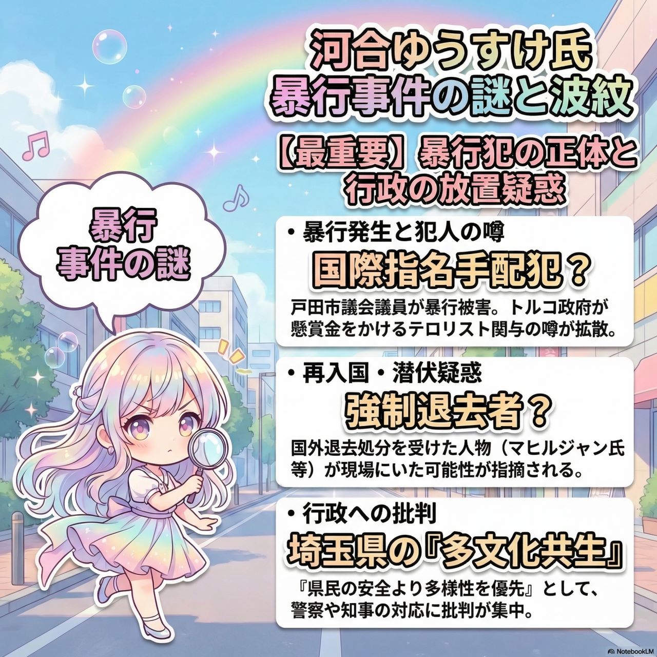 大野元裕埼玉県知事は多文化共生を掲げていますが、その結果として河合ゆうすけ氏のような日本人市民が暴力を受けても逮捕者が出ない「無法地帯化」を招いているとの批判が根強いです。