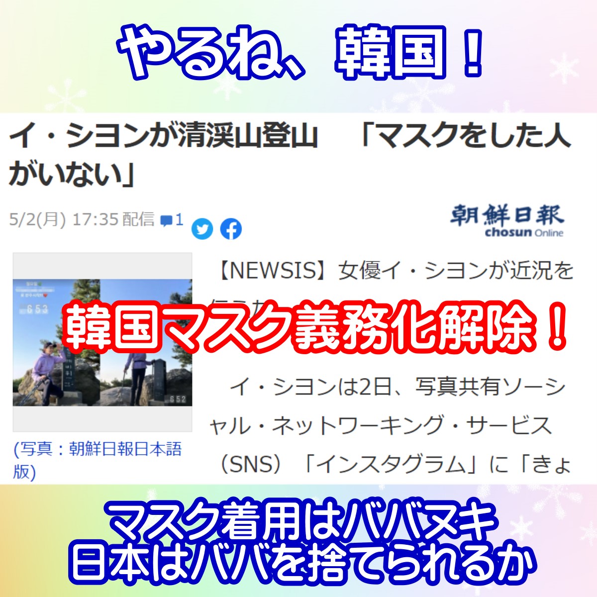 2022/4/29より韓国ではマスクの着用義務化を解除。 日本のマスコミには不都合なコロナ対策なのでネガキャン。 ただし屋外のみということで、ギリギリ日本も逆転のチャンスあり? あとは日本人が、テレビや新聞によるマスコミのデマ、専門家の妄想を無視すること。それだけでしょうね。 あ、緊急事態条項のような悪さにはNO!を突きつけて追放する必要がありますね。 マスクはまだ外せない!と韓国では義務化は解除となっても、韓国人は外してないとよ!らしい。