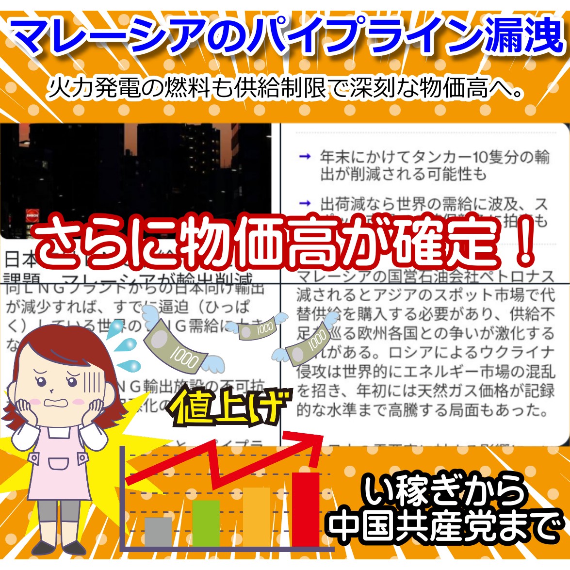 日本第2位の取引先である、マレーシア・ペトロナス社のLNGパイプラインが破損し、日本への供給を確保できなくなった。同社は「不可抗力宣言」を発動。日本政府は電力会社に1,900億円の特別ローンを設定した。ロシア人のツイート「最も打撃を受けるのは日本人」。やられたね。 https://bloomberg.com/news/articles/2022-10-06/japan-faces-new-lng-supply-challenge-as-malaysia-curbs-shipments