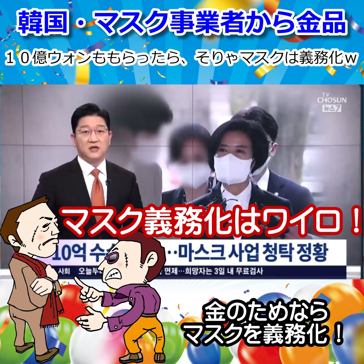 コロナウイルスの感染予防効果のないマスク。 しかし義務化が続いた理由は、マスク業者からワイロを払っていたから。 政治家に10億ウォンは1億円ですかね。 日本のマスク推奨も、金目的なのでしょうね。   1億円ももらえるのなら、そりゃ義務化を主張するでしょう。 私なら100万円で、マスク警察になるかも・・・w 東大のマスク実験をエビデンスだ! なんてツイートしちゃうかも・・・