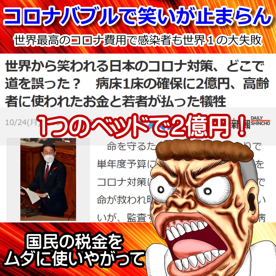 病床1床の確保に2億円を代表とするコロナ補助金詐欺。 存在も証明できないウイルス騒動で、医療業界への確変ルール。 コロナ対策費は世界1でも世界最悪の感染者を記録という醜態。 諸悪の根源はなんでしょう?   総額で約300兆円ですから、これを不況や物価高の対策に使えば日本人の生活は楽になり不幸を減らせます。すべてがムダとは言えなくても、14兆円とも言われるコロナ予備費の90%は使途不明金。 新型コロナウイルスのためにお金は使いけど、詳細は明かせない。 これが通るんだから、すごいよね。   まぁコロナは怖いなんて言ってるのは、世界でも日本だけ。 バカげた感染症対策を続ける限り、生活はどんどん苦しくなるだけ。 社会保障の負担増だけでなく、色々な増税も発表されていますからね。