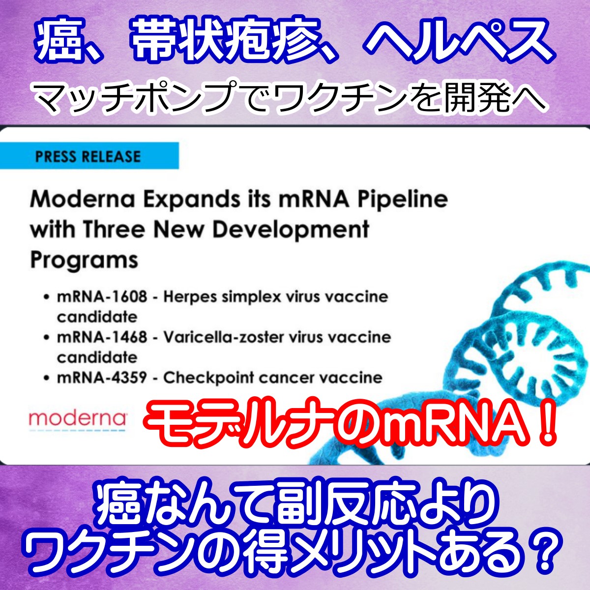 3回目接種で深刻な免疫低下と深刻は健康被害が明らかになった、mRNAコロナワクチン。 でも安心してください。 モデルナが、ヘルペス・帯状疱疹・癌のmRNAワクチンを開発するそうですよ。 ん?これって・・・モデルナ公式: 癌、帯状疱疹、ヘルペスのmRNAワクチンを開発発表。