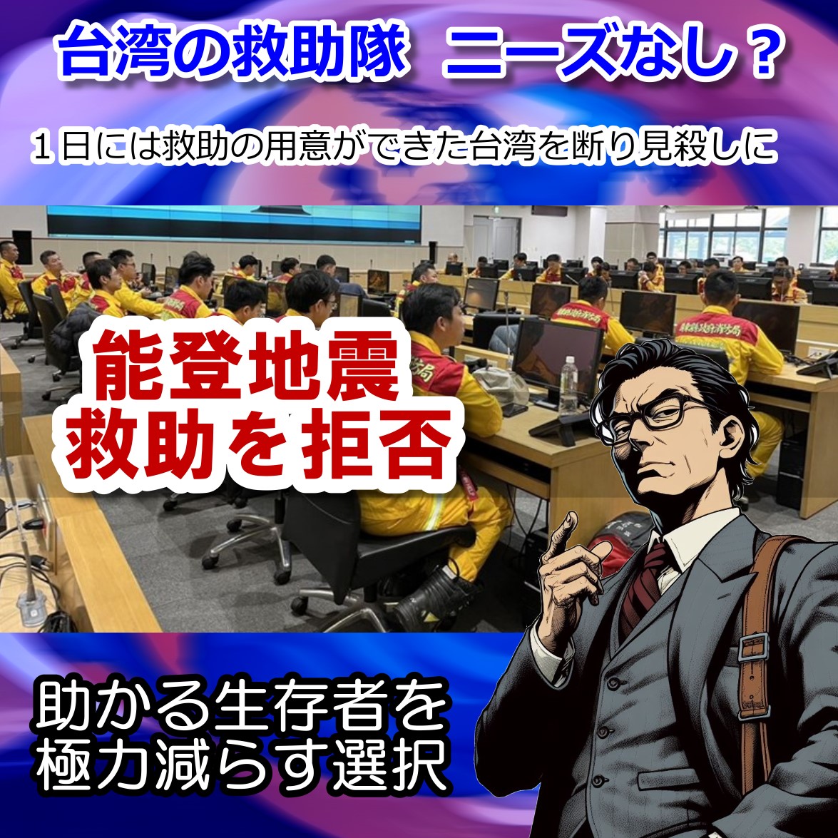 日本政府 能登地震で台湾からの救助隊を拒否!日本政府が台湾からの救助隊を「ニーズなし」として拒否。能登地震くらいの被害では、別に何もする必要なしと判断。情報提供も食糧支援も行わず、できることは増税くらいか。頼みは自衛隊に民間企業だけか・・・...
