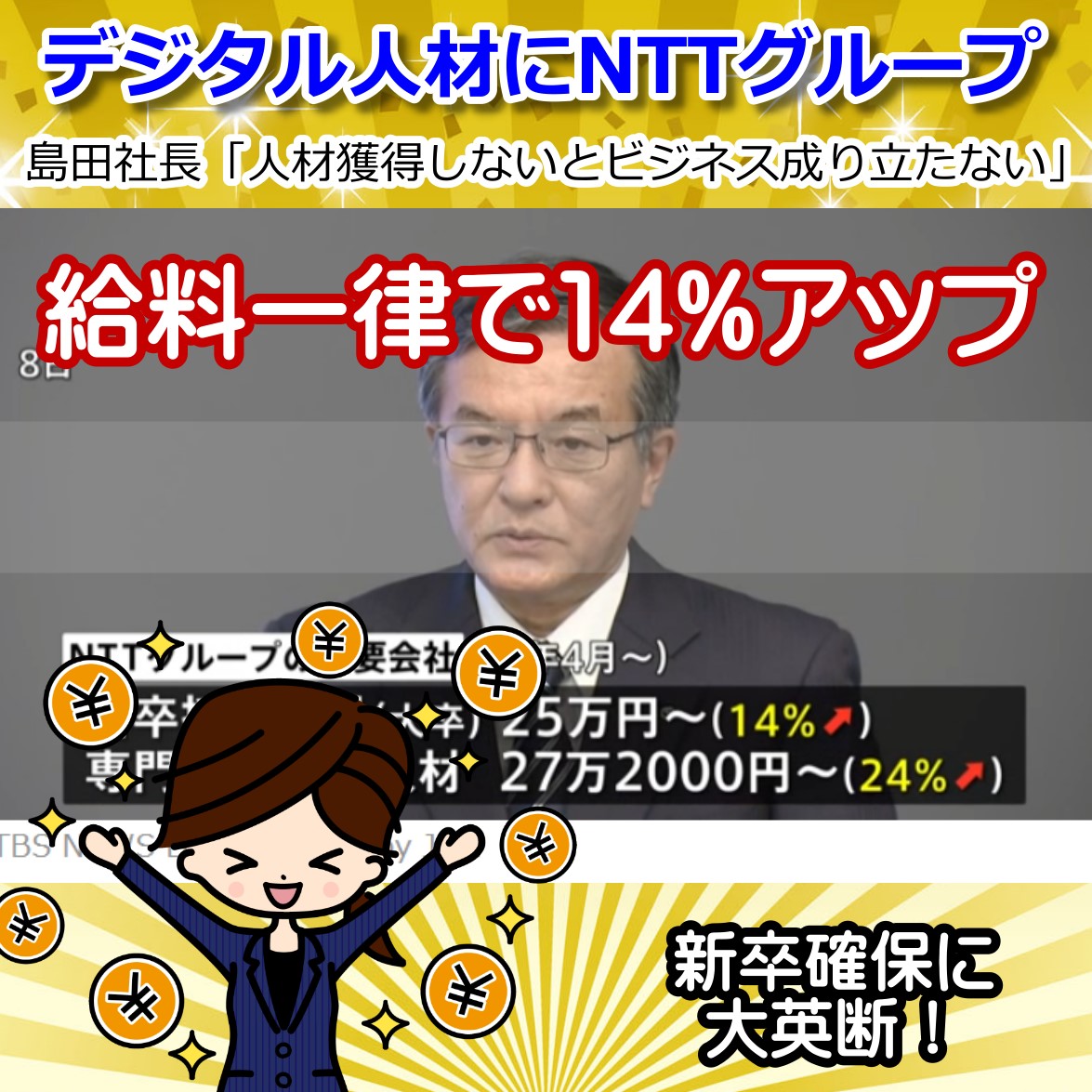 【速報】NTT主要各社 来年4月から新卒採用の給料一律で14%引き上げ…専門性の高い人材は24%引き上げ…島田社長「人材獲得しないとビジネス成り立たない」