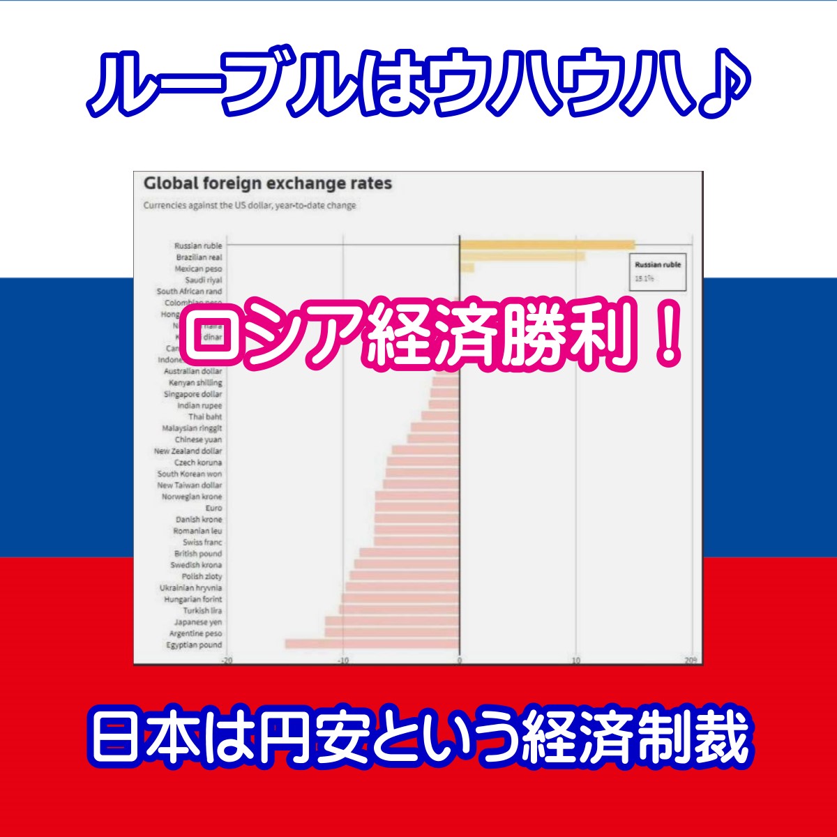 ルーブル🇷🇺は対ドルで世界一強い通貨に。ロシア🇷🇺は輸出原油が高騰して経常収支過去最高、日本円🇯🇵はビリから3番めの弱さに。日本🇯🇵はセルフ制裁と円安で大赤字収支になった。全て好戦的な議員と吊られた取り巻きの🐑🇯🇵のせい。 pic.twitter.com/YYJku9NHNp