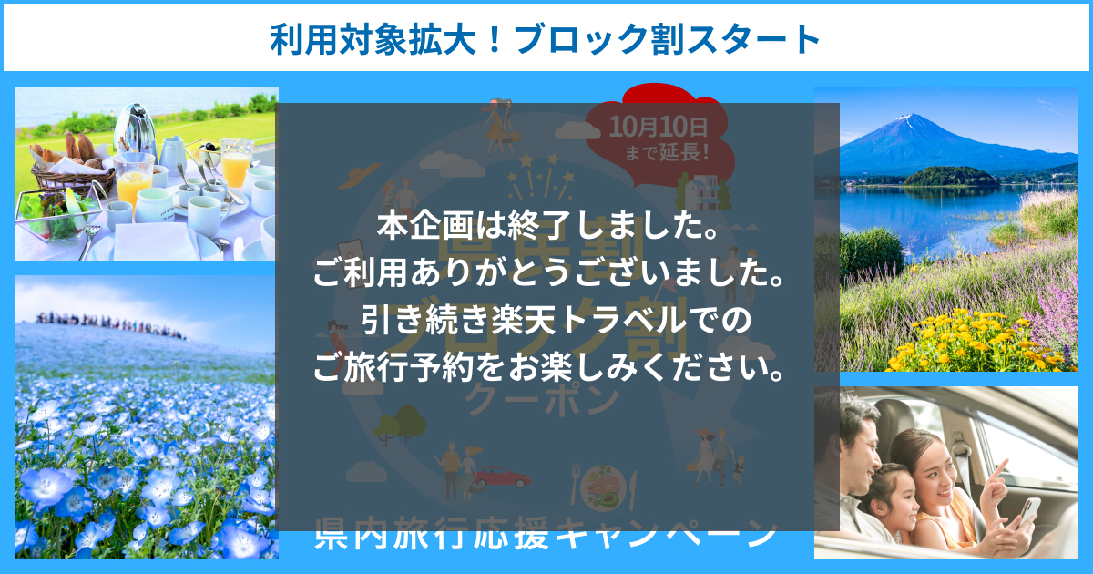 ✅全国旅行割 10月11日開始と発表されました🎤✨ 「後から適用」確約は楽天トラベルのみ🏨 他社の足並みが揃って値上げされる前に確保必須です⏰ 👇最高級ホテルクーポン👇クーポン祭り 最高級ホテル・旅館 | LUXURY SELECTION 【楽天トラベル】楽天トラベルが厳選した一度は泊まりたい宿。大切で、贅沢な、忘れられない旅をしたいときに。楽天トラベルが独自に定めた厳しい基準により「最高級」と認定されたホテル・旅館をご紹介します。👇県民割 値引きクーポン満載!お得なクーポン祭 【楽天トラベル】【楽天トラベルのお得なクーポン祭】国内宿泊、楽パック(交通+宿)、レンタカーの予約に使える割引クーポンをご用意!ぜひお見逃しなく!キャンペーンページはこちらから⇒#朝コレ #全国旅行割 県民割・ブロック割クーポン:県内旅行応援キャンペーン 【楽天トラベル】県民割・ブロック割クーポン配布中!安心な旅を楽しもう!お住いの地域周辺の宿が対象のクーポンや、各エリアの観光情報をご紹介!ホテル・旅館のご予約なら日本最大級の宿泊予約サイト「楽天トラベル」で!