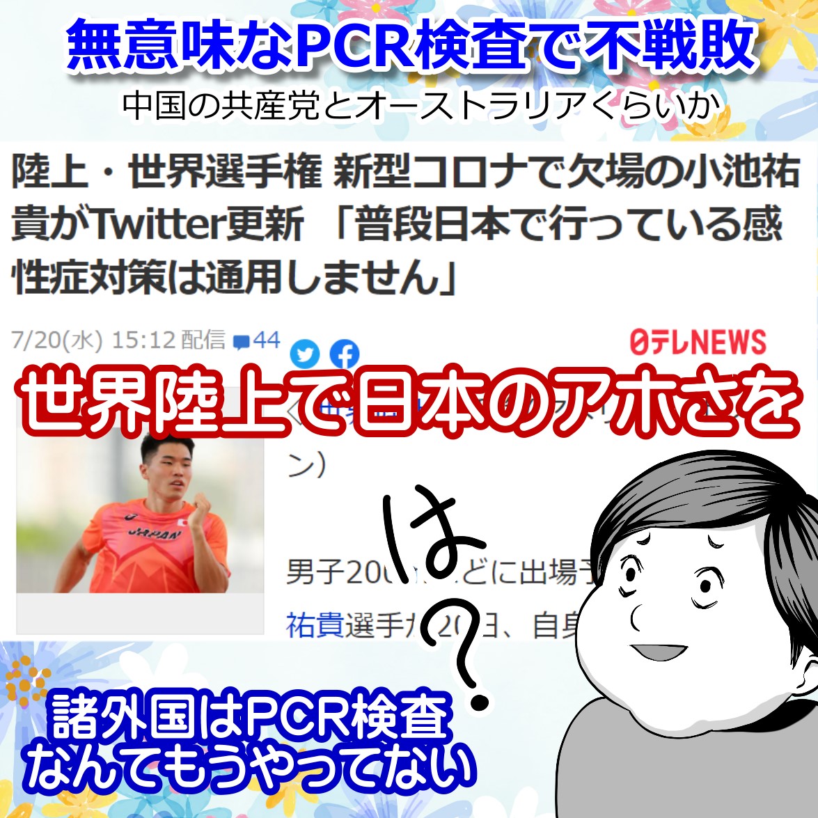 世界陸上で、マラソン鈴木・一山・新谷、200m小池選手らがコロ陽性のため不出場となった。米国はとっくの昔にPCR検査なんかやっていないし、マスクもしていないのに何で?。どうやら、日本陸連が勝手にPCR検査して、勝手に不出場にしてるらしい。日本政府の陽性者目標10万人に協力するなよ。アホか。