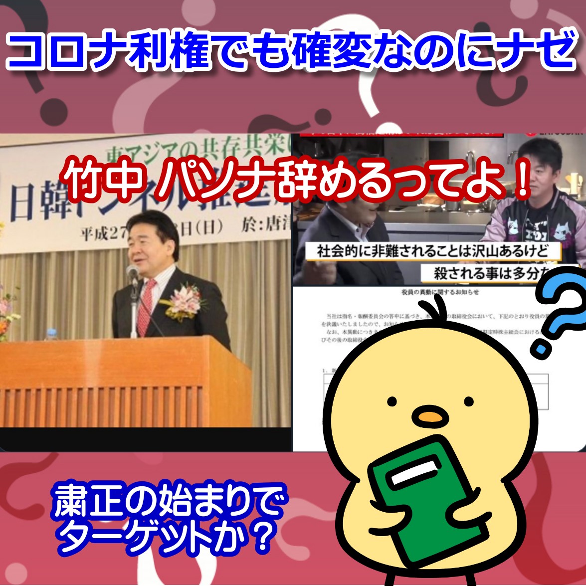 持続加給金や集団接種ビジネスなど、コロナでも笑いがとまらないパソナ。 ここにきて竹中平蔵さんが辞任の発表。 日本の不幸を利益に変えた錬金術師がナゼ? これを機にコロナワクチンの被害者は減り、派遣業も見直しで日本復活になるか?電通と並ぶ、日本の害悪二大帝国の内、パソナ皇帝が退位、と。 “同社の広報担当者によると、本人から退任の申し出があった。今後、経営に直接関与はしないという。” 竹中平蔵氏、パソナグループの取締役を退任 8月に正式決定