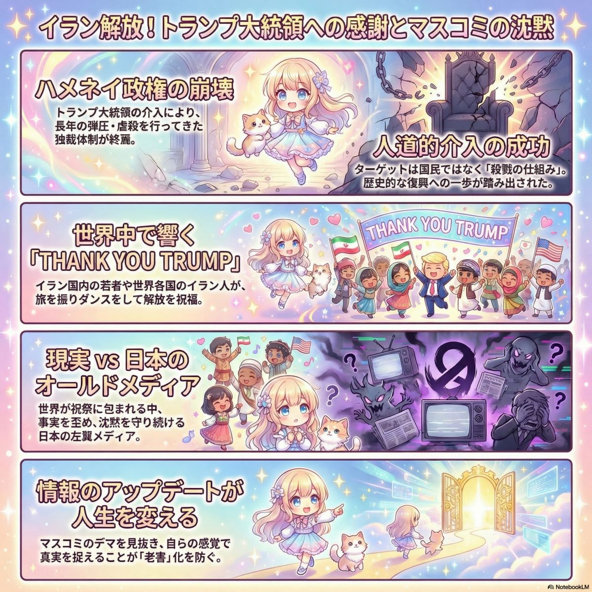 SNSに投稿された現地の映像(https://twitter.com/numururetsupeo/status/2027886875927871708)では、イラン国民が「THANK YOU TRUMP」と掲げ、歓喜する様子が確認されています。