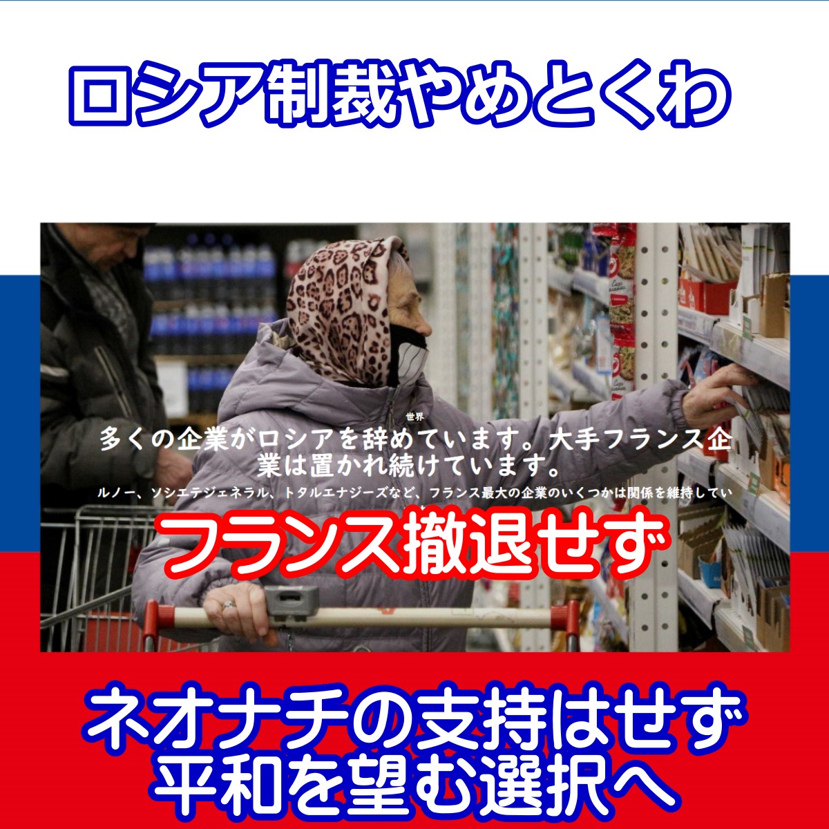 ウクライナ侵攻とされるフェイクで経済制裁を行うはずだったフランス。 国民の支持もあり、ネオナチのウクライナの支援はせず。 ロシアとの経済も継続で安定。 コロナを終われず、戦争を支援している日本。 経済は大丈夫なのでしょうか?