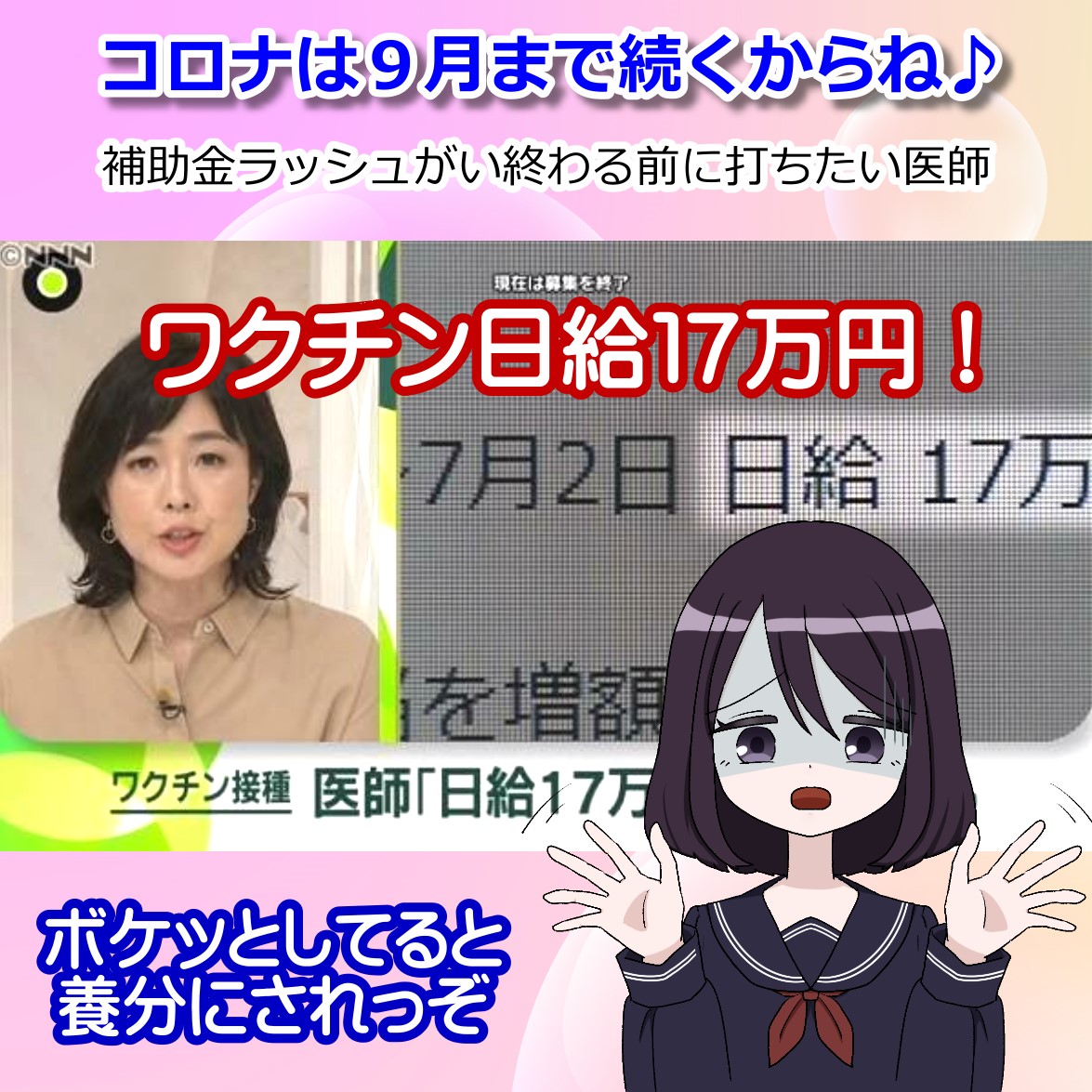 コロナ患者は診ようともしない癖に、日給17万円に群がる医師達。金を出す自治体もワクチンを打つ医師達も自己保身ばかりで厭らしい話だね。そしてコロナで苦境に喘ぐ業界業種には不十分な補償しかせずに無意味な対策をダラダラと続ける。全く狂ってるね日本は??